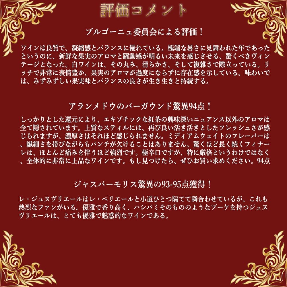 他の画像を見る ジュヴレ シャンベルタン レ マルシェ 2023 蔵出し作品 ドメーヌ オーディフレッド元詰 AOCジュヴレ シャンベルタンGevrey-Chambertin Les Marchais 2023 Domaine Audiffred 赤ワイン フランス フルボディ 辛口 当店特別価格 ¥ 13,125 税込 カートに入れる お気に入りに登録する