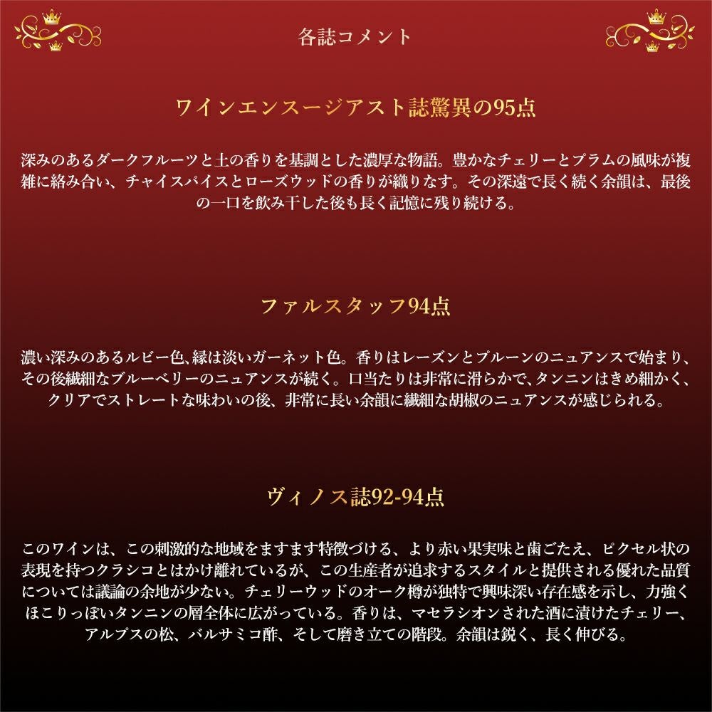他の画像を見る モレ サン ドニ 2023 蔵出し作品 ドメーヌ オーディフレッド元詰 AOCモレ サン ドニ 14.5%Morey St. Denis 2023 Domaine Audiffred AOC Morey-St.-Denis 赤ワイン フランス フルボディ 辛口 当店特別価格 ¥ 11,202 税込 カートに入れる お気に入りに登録する