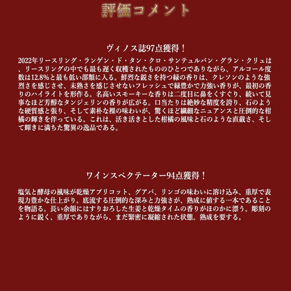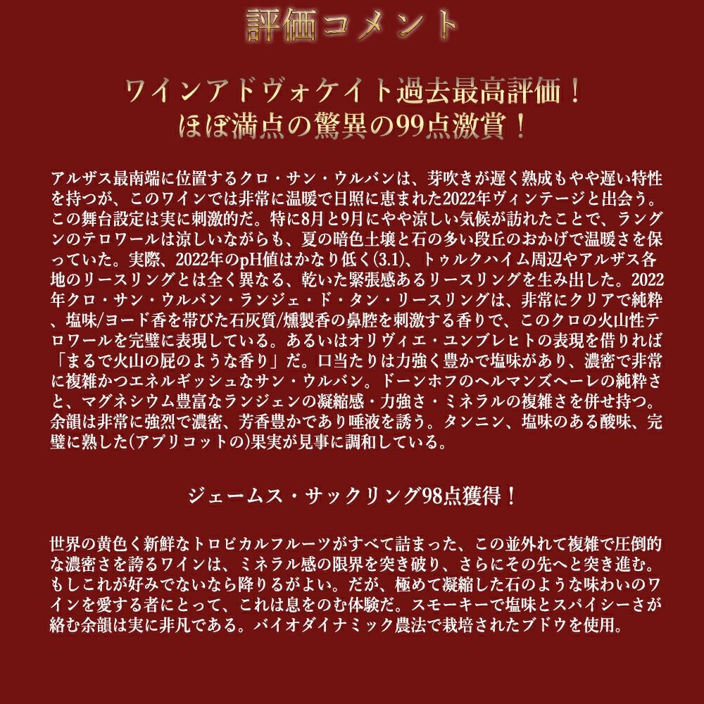 他の画像を見る アルザス ランゲン ド タン クロ サンテュルバン グラン クリュ 特級 リースリング 2022 蔵出し限定品 ドメーヌ ツィント フンブレヒト元詰Alsace Rangen de THANN Clos Saint Urbain Riesling 白ワイン フランス 辛口 自然派 当店特別価格 ¥ 15,884 税込 カートに入れる お気に入りに登録する