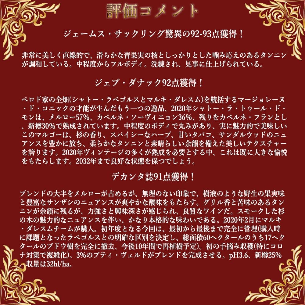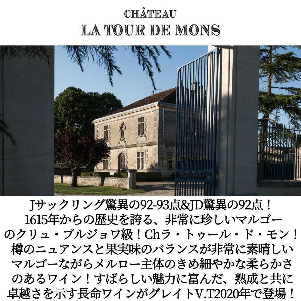 他の画像を見る シャトー ラ トゥール ド モン 2020 AOCマルゴー クリュ ブルジョワ JS驚異の92-93点&ジェブ ダナック92点&デカンタ誌91点Chateau La Tour de Mons 2020 AOC Margaux Cru 赤ワイン フランス フルボディ 辛口 当店特別価格 ¥ 4,138 税込 カートに入れる お気に入りに登録する