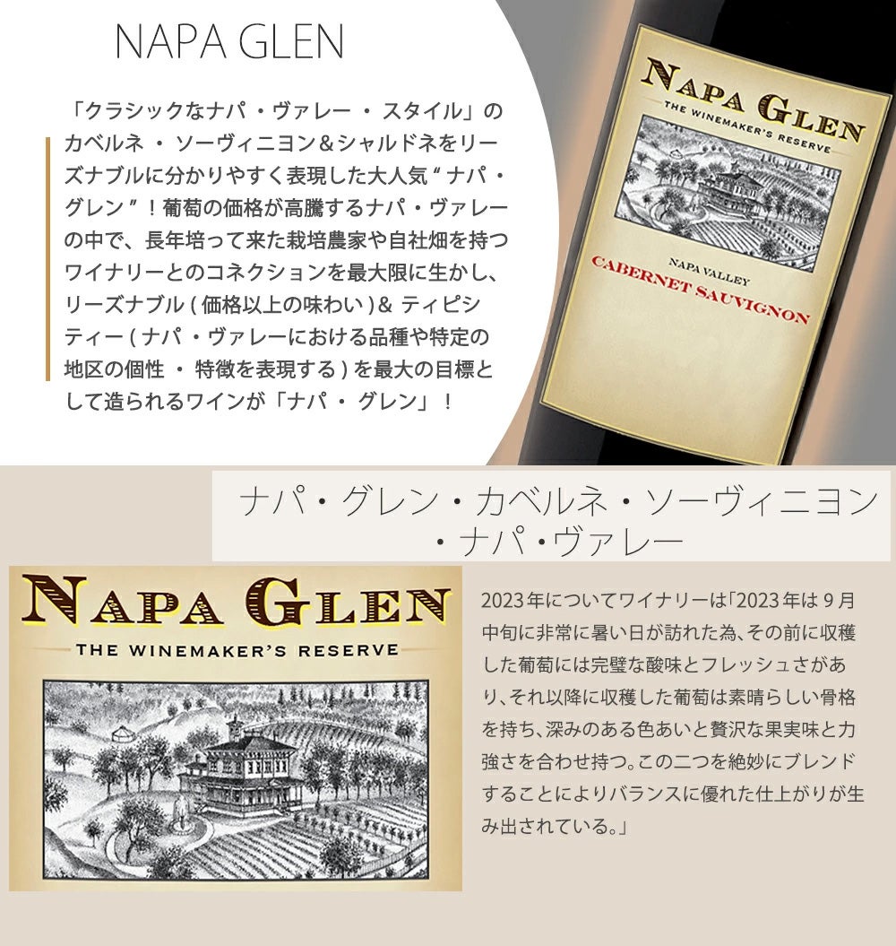 他の画像を見る ナパ グレン カベルネ ソーヴィニヨン ナパ ヴァレー 2023 AVAナパ ヴァレー アルコール度数14.5%NAPA GLEN Cabernet Sauvignon Napa Valley 2023 AVA Napa Valley 赤ワイン アメリカ フルボディ 辛口 当店特別価格 ¥ 3,762 税込 カートに入れる お気に入りに登録する