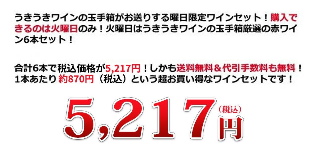 他の画像を見る 【超限定】第二弾うきうきワイン究極火曜日6本セット(赤6本)送料 代引き手数料無料!しかも同梱可!!<火曜セット> 赤ワイン 当店特別価格 ¥ 4,956 税込 カートに入れる お気に入りに登録する