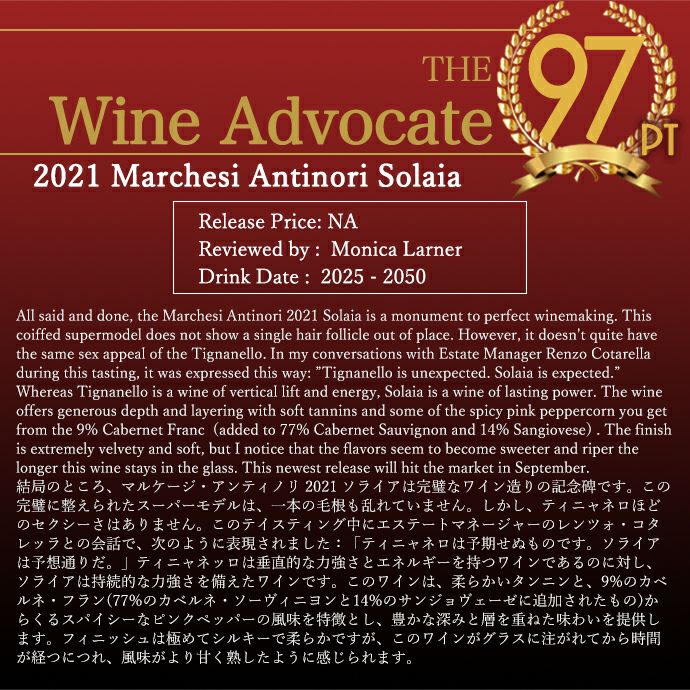 他の画像を見る ソライア 2021 アンティノリ イタリア トスカーナ (赤 フルボディ) 正規品 ヴィノス誌驚異の100点満点&WS98点&WA97点&JS97点Solaia 2021 Marchesi Antinori Toscana 赤ワイン イタリア フルボディ 辛口 当店特別価格 ¥ 45,227 税込 カートに入れる お気に入りに登録する