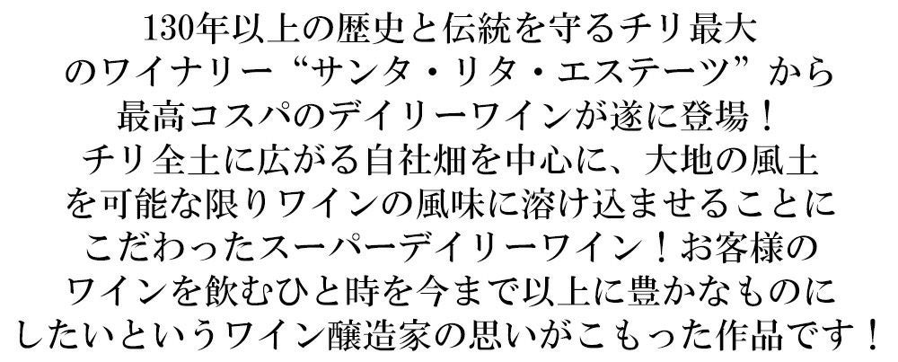他の画像を見る テラ アンディーナ アンデスの大地 カベルネ ソーヴィニヨン 2023 サンタ リタ エステーツ チリ セントラルヴァレーTerra Andina Cabernet Sauvignon 2023 Santa Rita Estates 赤ワイン チリ ミディアムボディ 辛口 当店特別価格 ¥ 1,042 税込 カートに入れる お気に入りに登録する
