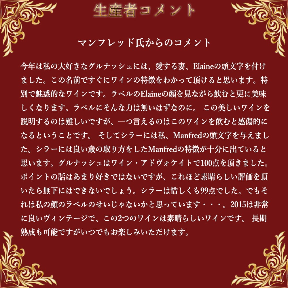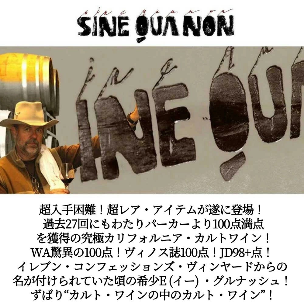 他の画像を見る シネ クア ノン E (イー) グルナッシュ イレブン コンフェッションズ ヴィンヤード 2015 蔵出し作品 マンフレッド クランクル元詰 ロウ封印SINE QUA NON E Grenache 2015 Produced & Bottled 赤ワイン アメリカ フルボディ 辛口 当店特別価格 ¥ 135,641 税込 カートに入れる お気に入りに登録する