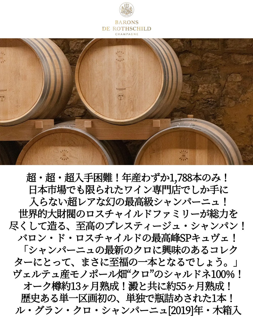 他の画像を見る 【木箱入】ル グラン クロ シャンパーニュ バロン ド ロスチャイルド モノポール ヴェルテュ ブラン ド ブラン プルミエ クリュ 2019 Champagne BARONS DE Rothschild Le Grand Clos Monopole Vertus Blanc de Blancs Premier Cru 2019 スパークリング シャンパン フランス 辛口 当店特別価格 ¥ 123,310 税込 カートに入れる お気に入りに登録する