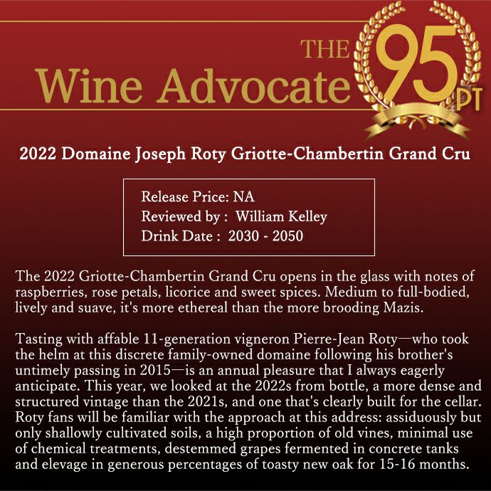 他の画像を見る マジ シャンベルタン グラン クリュ 特級 2022 蔵出し限定品 ドメーヌ ジョセフ ロティ元詰 ワインアドヴォケイト誌驚異の95点Mazis Chambertin Grand Cru 2022 Domaine Joseph Roty 赤ワイン フランス フルボディ 辛口 当店特別価格 ¥ 88,804 税込 カートに入れる お気に入りに登録する