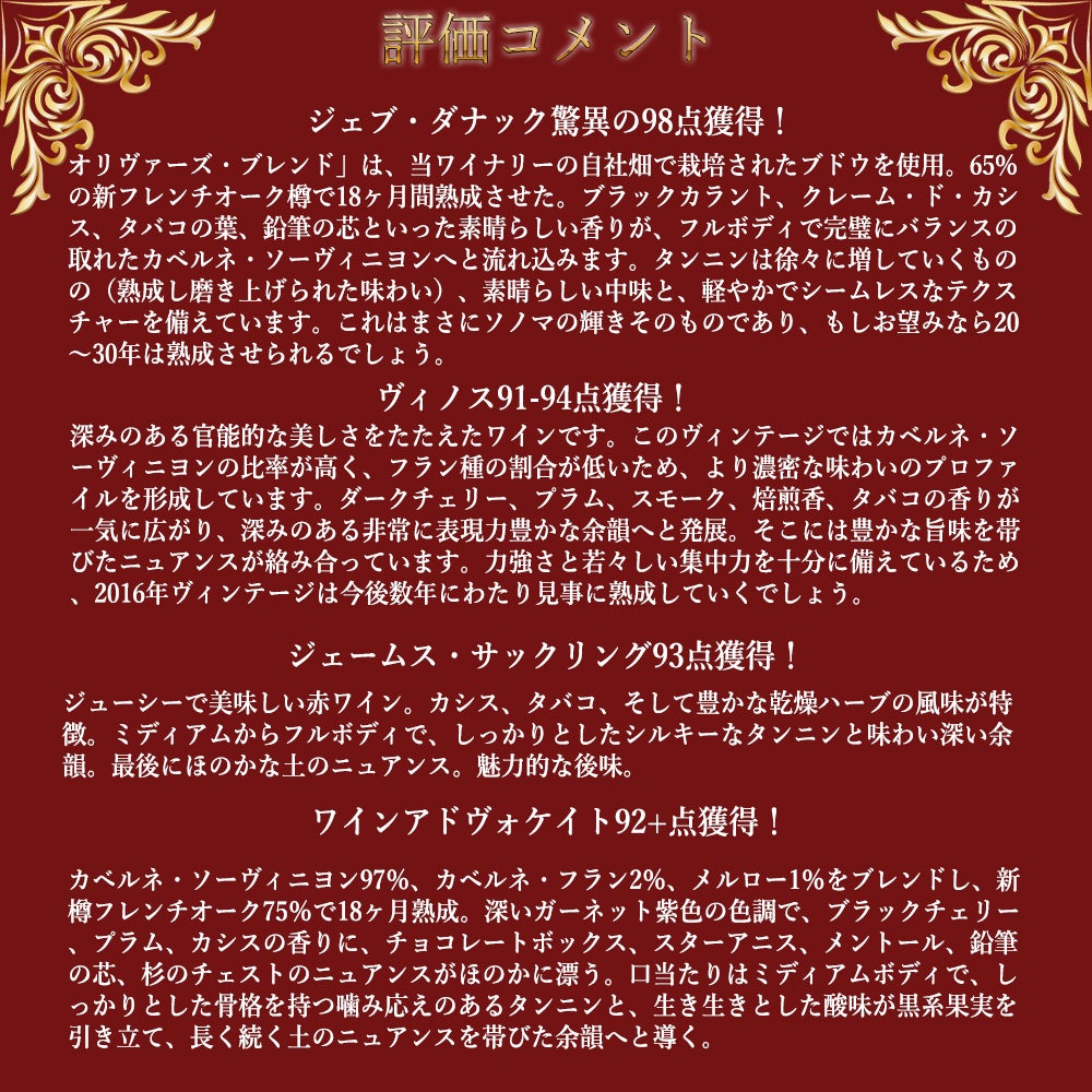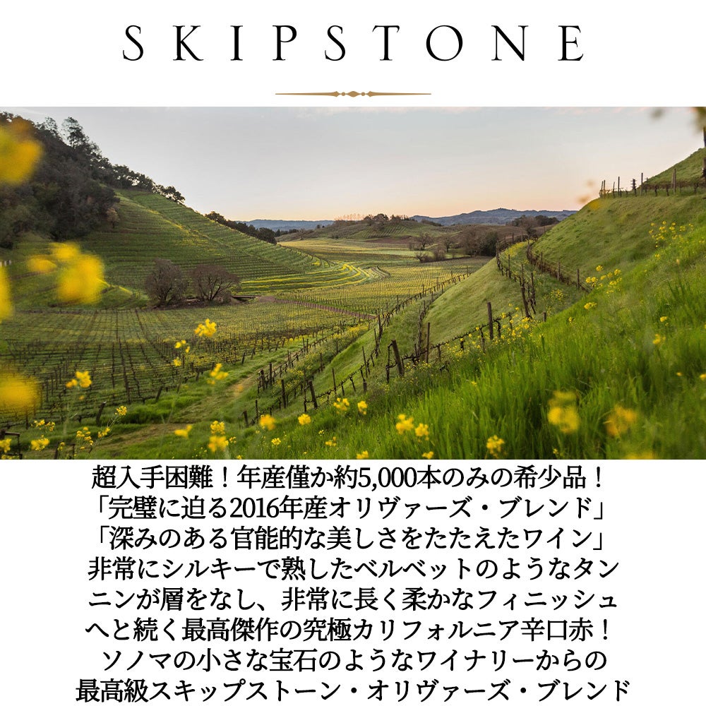 他の画像を見る スキップストーン オリヴァーズ ブレンド 2016 蔵出し品 (アレキサンダー ヴァレー) スキップストーン 超重厚ヘヴィーボトル JD98点SKIPSTONE OLIVER'S BLEND 2016 Alexander Valley 赤ワイン フランス フルボディ 辛口 当店特別価格 ¥ 25,059 税込 カートに入れる お気に入りに登録する