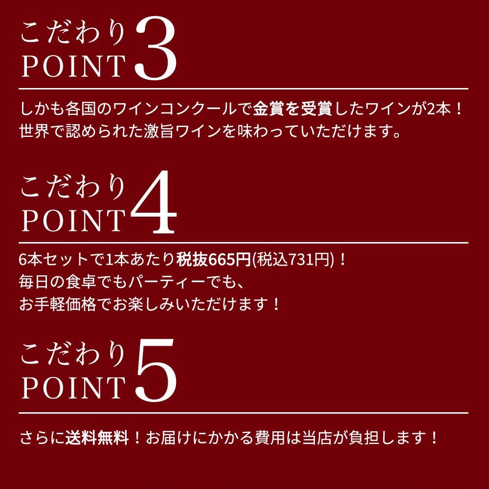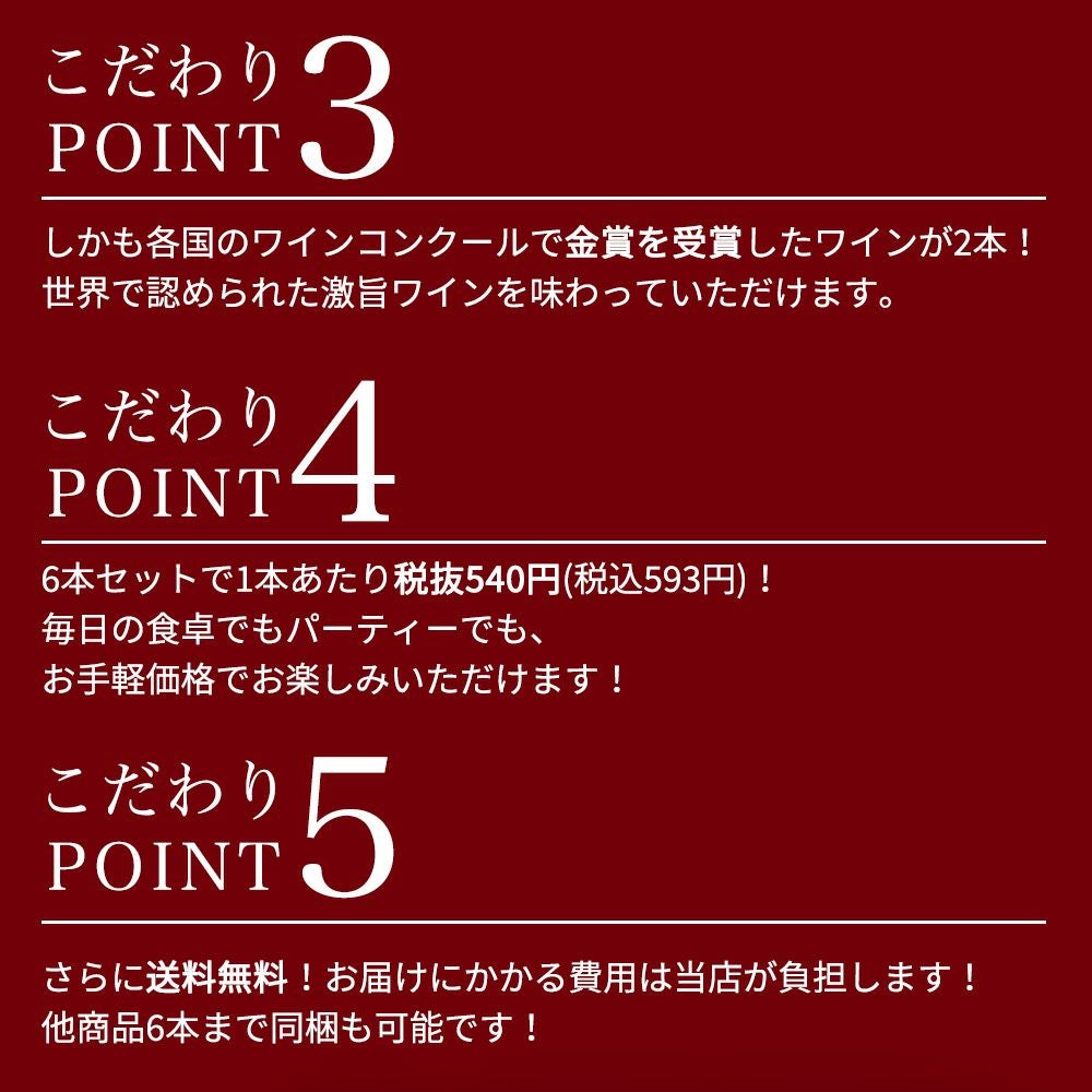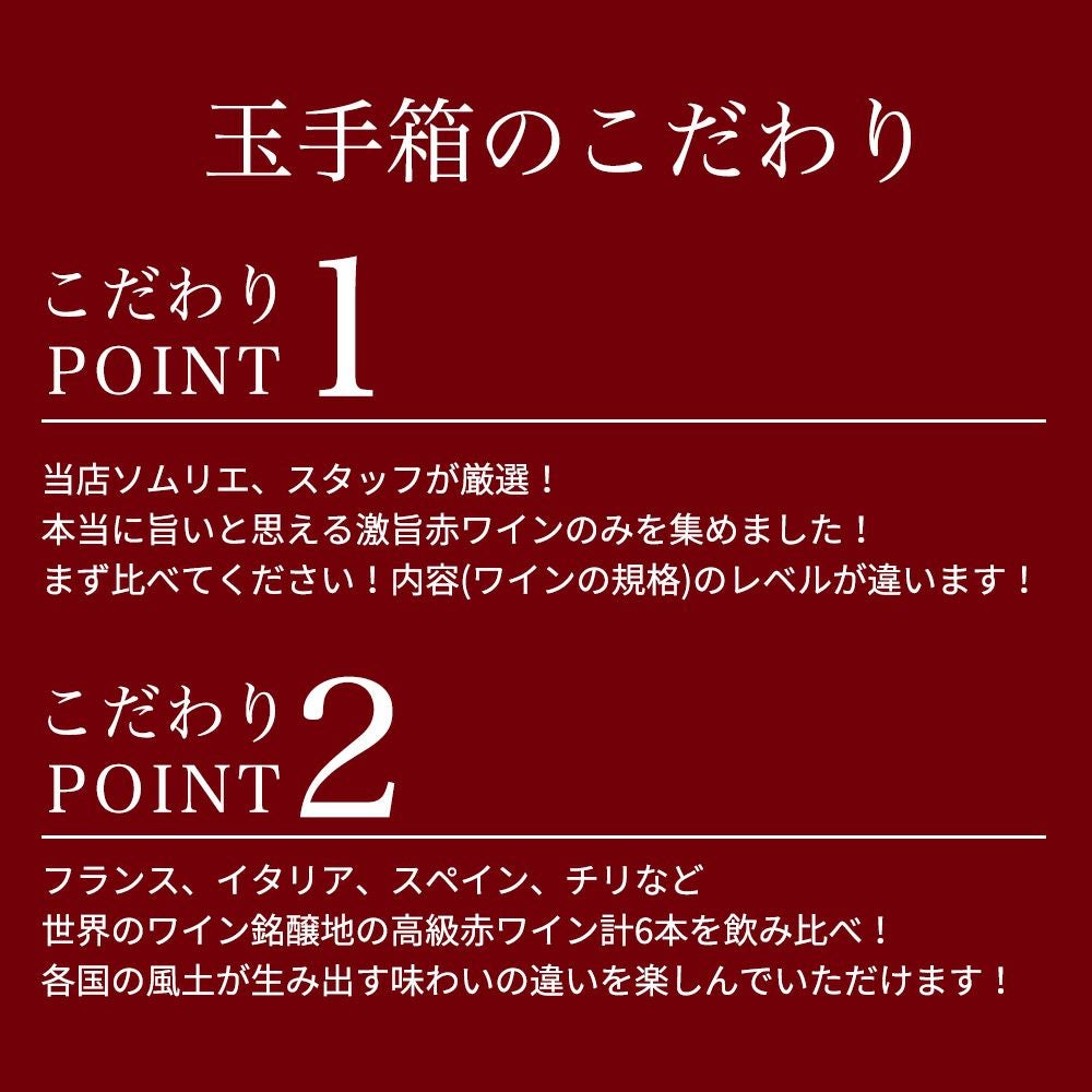 他の画像を見る 【送料無料】玉手箱厳選 各世界の極上ミディアムボディ飲み比べ赤ワイン6本セット ワインセット 赤ワイン ワインセット ミディアムボディ 送料無料 当店特別価格 ¥ 5,204 税込 カートに入れる お気に入りに登録する