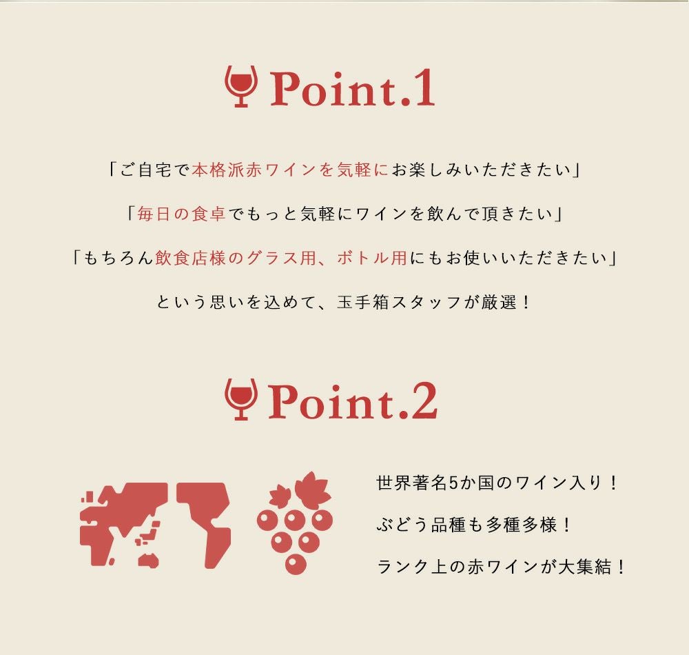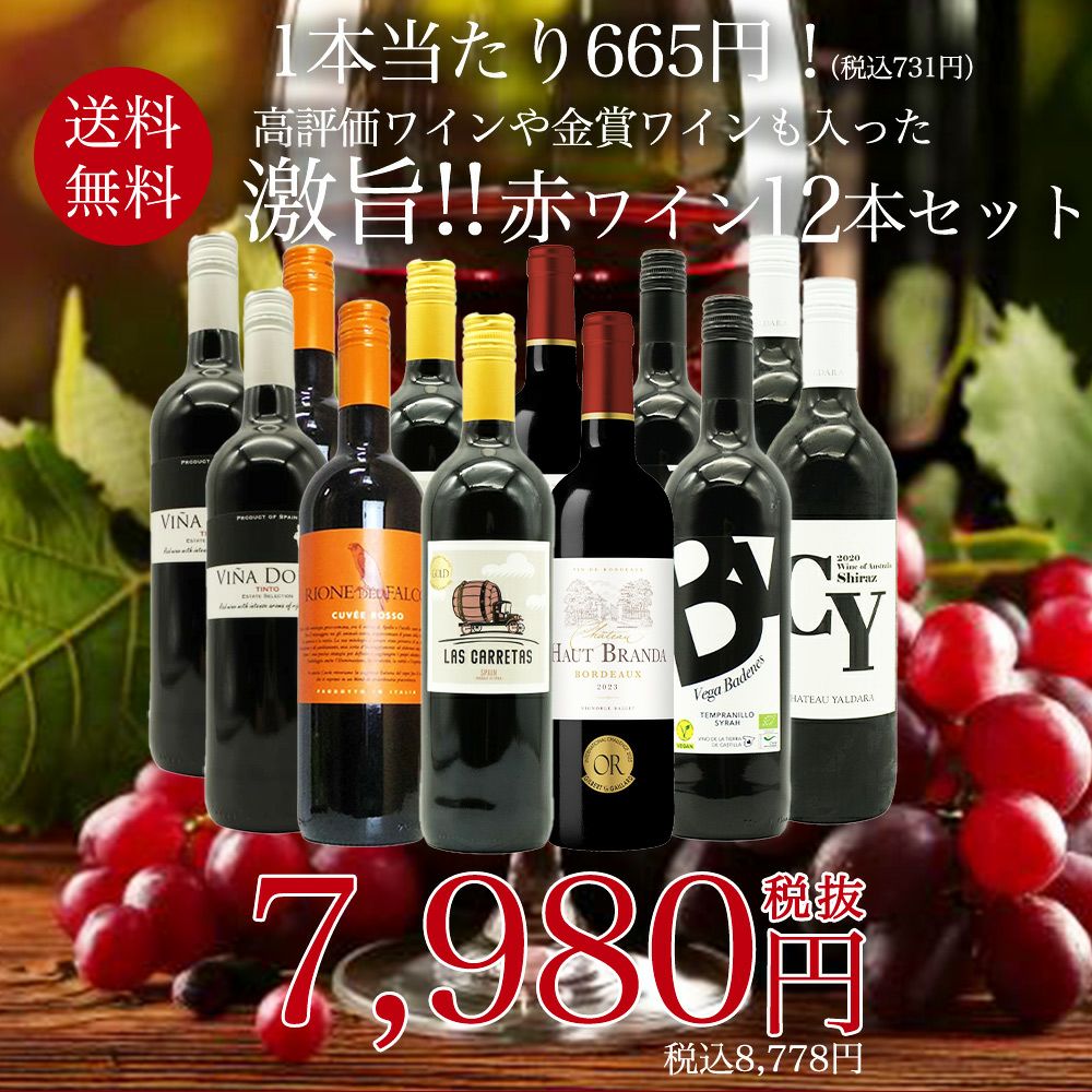 他の画像を見る 【送料無料】玉手箱厳選!高評価ワインや金賞ワインも入った激旨赤12本セット ワインセット (6種類×各2本)Tamatebako Select 12 Wine Set 赤ワイン ワインセット 送料無料 当店特別価格 ¥ 8,339 税込 カートに入れる お気に入りに登録する