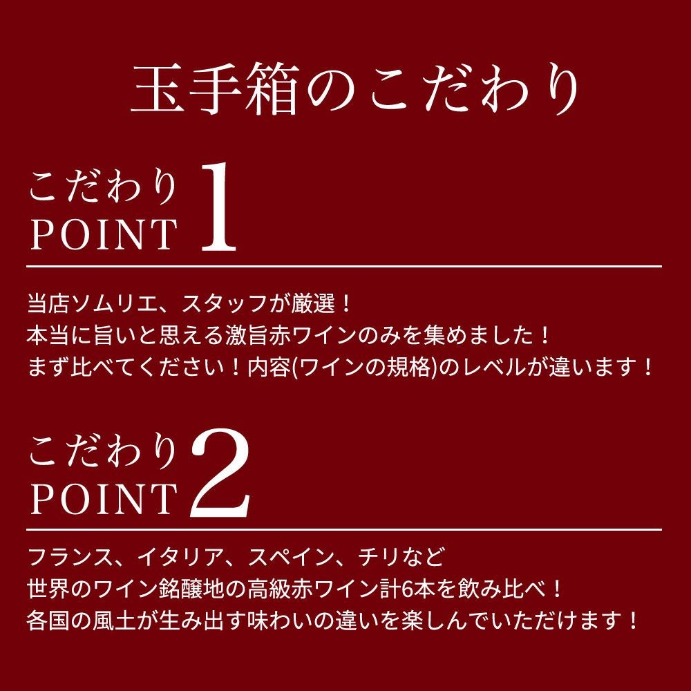他の画像を見る 【送料無料】玉手箱厳選!高評価ワインや金賞ワインも入った激旨赤6本セット ワインセットTamatebako Select 6 Wine Set 赤ワイン ワインセット 送料無料 当店特別価格 ¥ 4,577 税込 カートに入れる お気に入りに登録する
