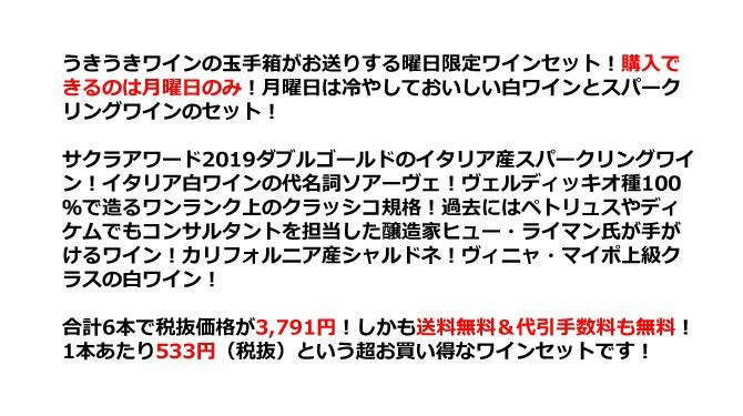 他の画像を見る 【超限定】【送料無料】うきうきワイン究極月曜日白ワイン6本セット(辛口白5本、発泡1本)<月曜セット>※商品入荷状況により、一部セット内容を変更させて頂く場合がございます。予めご了承下さいます様お願い致します。 ワインセット 白ワイン スパークリング ワインセット 辛口 送料無料 当店特別価格 ¥ 3,961 税込 カートに入れる お気に入りに登録する