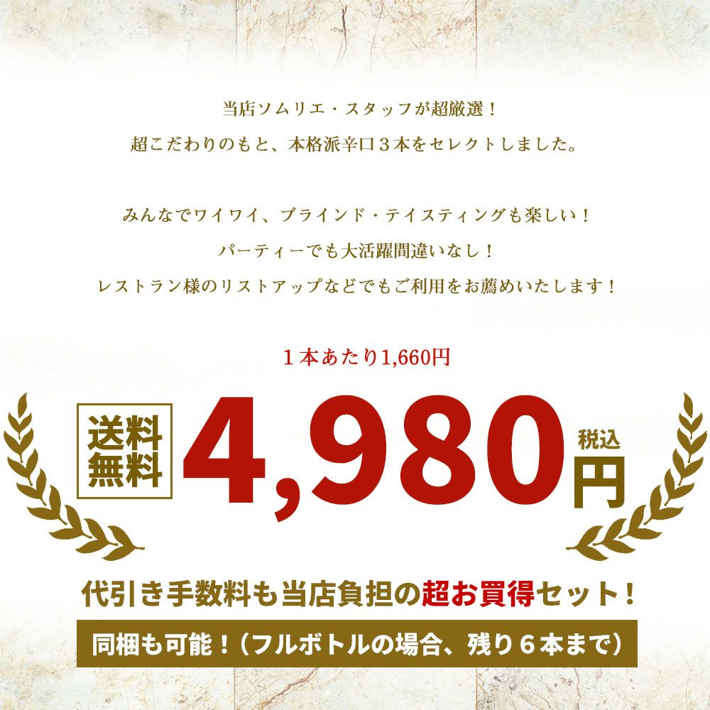 他の画像を見る 【送料無料】当店厳選!世界の白ワインが味わえる!超極上辛口白ワイン究極スペシャル飲み比べ5本セット 白ワイン 辛口 送料無料 当店特別価格 ¥ 4,159 税込 カートに入れる お気に入りに登録する