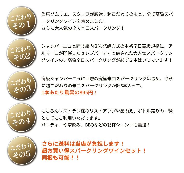 他の画像を見る 【送料無料】玉手箱厳選!すべて本格派の極上辛口泡6本セット ワインセット スパークリングTamatebako Select Sparkling 6 Set スパークリング ワインセット 送料無料 当店特別価格 ¥ 5,099 税込 カートに入れる お気に入りに登録する