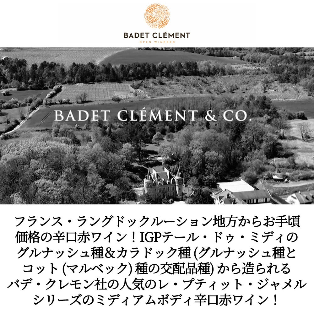 他の画像を見る レ プティット ジャメル ルージュ 2024 バデ クレモン社 フランス ラングドックルーションLes Petites Jamelles Rouge 2024 Badet Clement & Co. (Badet Clement) 赤ワイン フランス ミディアムボディ 辛口 当店特別価格 ¥ 1,086 税込 カートに入れる お気に入りに登録する