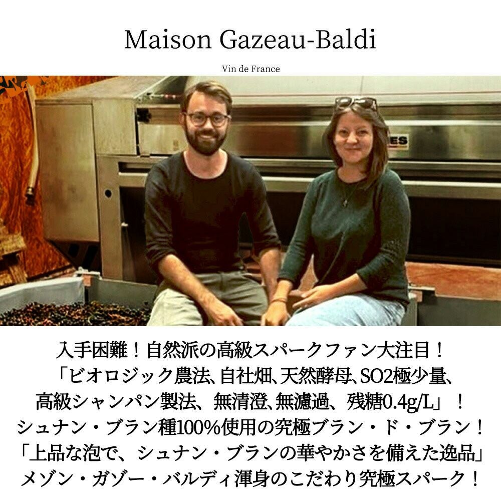 他の画像を見る ワゾー ブリュット(2022)年 メゾン ガゾー バルディ シャンパーニュ方式 自然派ビオロジックWazoh Brut NV (2022) Maison Cazeau-Baldi Vin de France Sparkling Wine 白ワイン フランス 辛口 自然派 当店特別価格 ¥ 4,472 税込 カートに入れる お気に入りに登録する