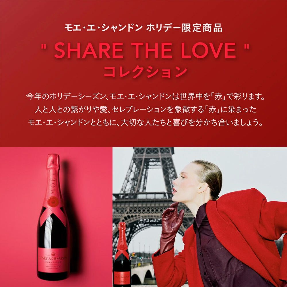他の画像を見る 【送料無料】モエ エ シャンドン モエ アンペリアル ロゼ シェア ザ ラブ コレクション (モエ エ シャンドン2025限定)Moet & Chandon Moet Imperial Rose SHARE THE LOVE COLLECTION スパークリング シャンパン ロゼ フランス 辛口 送料無料 当店特別価格 ¥ 10,032 税込 カートに入れる お気に入りに登録する