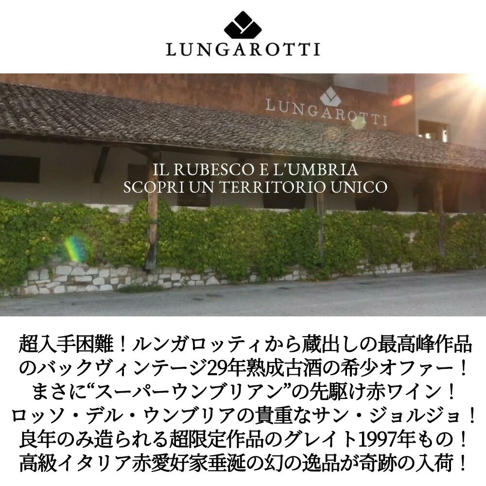 他の画像を見る 【箱入】サン ジョルジョ ロッソ デル ウンブリア 1997 蔵出し品 ルンガロッティ社元詰 IGTロッソ デッルンブリア イタリア赤ワインの最高峰Lungarotti San Giorgio Rosso dell Umbria 1997 赤ワイン イタリア フルボディ 辛口 当店特別価格 ¥ 16,045 税込 カートに入れる お気に入りに登録する
