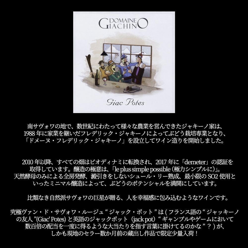 他の画像を見る ジャック ポット 2024 蔵出し限定品 ドメーヌ ジャキーノ(フレデリック ジャキーノ家)元詰 AOCヴァン ド サヴォワ モンドゥーズ 自然派Giac' Potes 2024 Domaine Giachino 赤ワイン フランス ミディアムボディ 辛口 自然派 当店特別価格 ¥ 4,180 税込 カートに入れる お気に入りに登録する