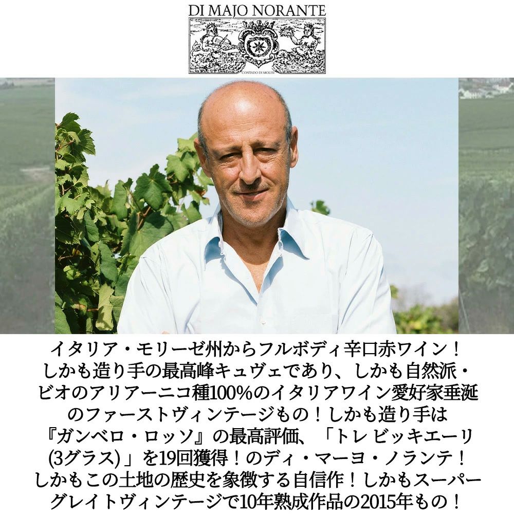 他の画像を見る サッシウス アリアーニコ デル モリーゼ リゼルヴァ 2015 蔵出し作品 ディ マーヨ ノランテ元詰 DOCモリーゼ 自然派Sassius Aglianico del Molise Riserva 2015 Di Majo Norante 赤ワイン イタリア フルボディ 辛口 自然派 当店特別価格 ¥ 8,056 税込 カートに入れる お気に入りに登録する