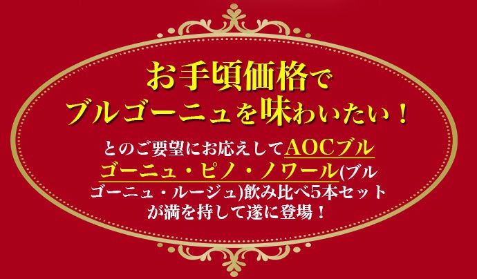 他の画像を見る 【送料無料】ピノ愛好家大注目!AOCブルゴーニュ ピノ ノワール5本飲み比べセット 有名メゾンも含むピノ ノワール(ブルゴーニュ ルージュ)飲み比べBourgogne Pinot Noir 5 SET ワインセット 赤ワイン ワインセット 送料無料 当店特別価格 ¥ 12,519 税込 カートに入れる お気に入りに登録する