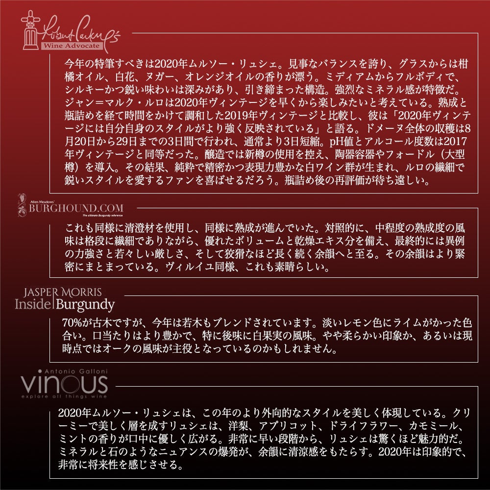 他の画像を見る ムルソー ルシェ 2020 ドメーヌ ルーロ元詰 (ジャン マルク ルーロ家) AOCムルソー 正規品 Meursault Luchets 2020 Domaine Roulot AOC Meursault 白ワイン フランス 辛口 当店特別価格 ¥ 83,391 税込 カートに入れる お気に入りに登録する