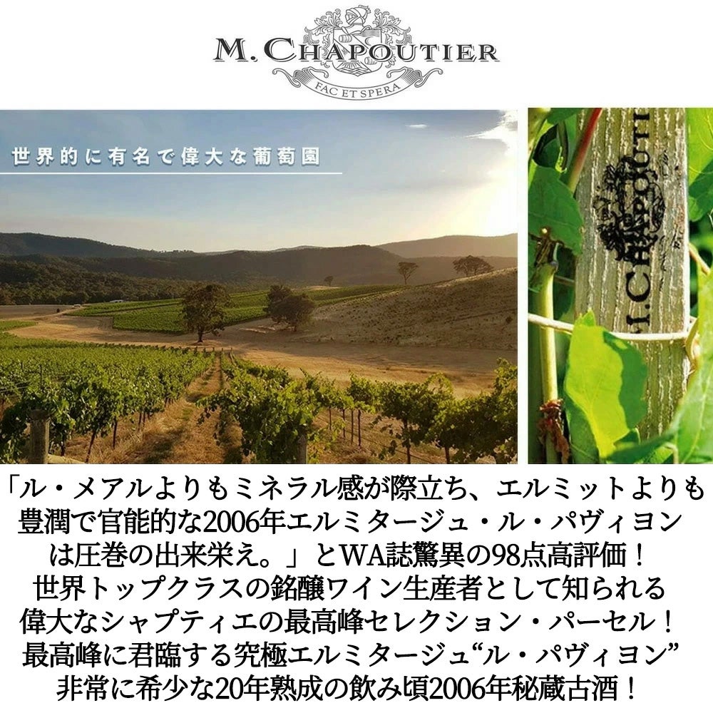 他の画像を見る エルミタージュ ル パヴィヨン ルージュ 2006 蔵出し限定品 M.シャプティエ元詰 最高峰のセレクション パーセルもの ロウ封印 自然派ERMITAGE Le Pavillon 2006 M.Chapoutier AOC 赤ワイン フランス フルボディ 辛口 自然派 当店特別価格 ¥ 28,308 税込 カートに入れる お気に入りに登録する