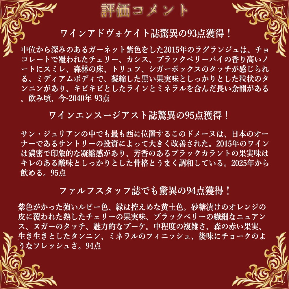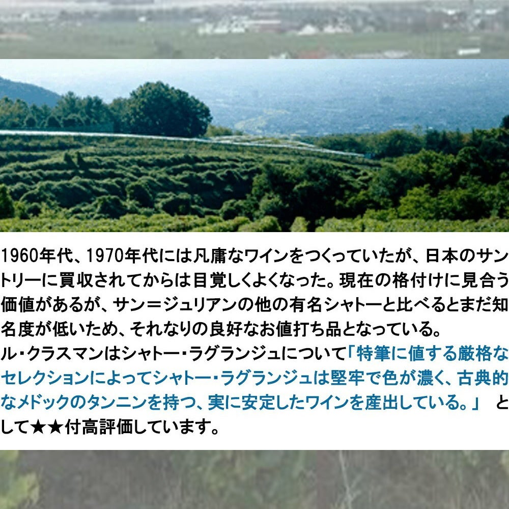 他の画像を見る 【大型サイズ】シャトー ラグランジュ 2015 Me GCC 公式格付第三級 AOCサン ジュリアン シャトー元詰 1500mlChateau Lagrange (MG) 2015 AOC Saint-Julien Grand Cru 赤ワイン フランス フルボディ 辛口 当店特別価格 ¥ 32,280 税込 カートに入れる お気に入りに登録する