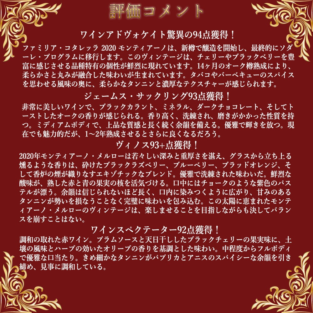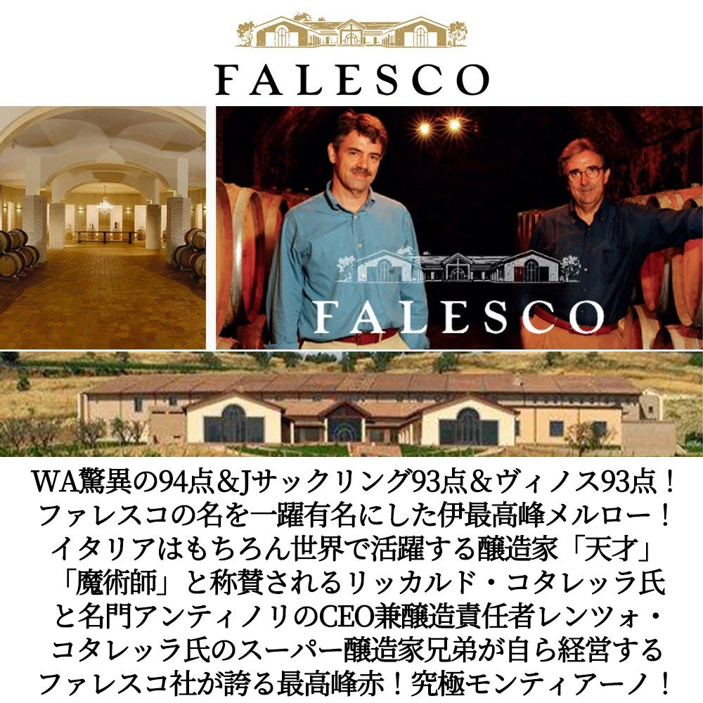 他の画像を見る モンティアーノ 2020 ファレスコ社元詰 IGTラツィオ ロッソ WA驚異の94点&JS93点&ヴィノス93点&WS92点 赤 辛口 フルボディMONTIANO 2020 FALESCO (IGT LAZIO) 赤ワイン イタリア フルボディ 辛口 当店特別価格 ¥ 9,384 税込 カートに入れる お気に入りに登録する
