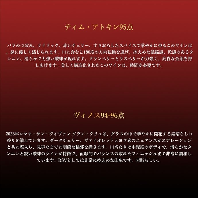 他の画像を見る ロマネ サン ヴィヴァン グラン クリュ 特級 2023 蔵出し限定品 ドメーヌ ド ラルロ元詰 AOCロマネ サン ヴィヴァン 特級Romanee Saint Vivant Grand Cru 2023 Domaine de L'Arlot 赤ワイン フランス フルボディ 辛口 自然派 当店特別価格 ¥ 170,753 税込 カートに入れる お気に入りに登録する