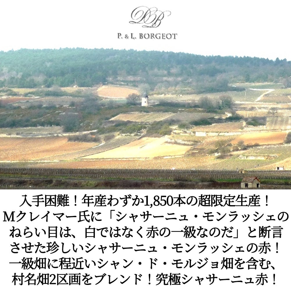 他の画像を見る シャサーニュ モンラッシェ ヴィエイユ ヴィーニュ ルージュ 2023 パスカル&ローラン ボルジョ元詰 AOCシャサーニュ 重厚ボトル 自然派Chassagne-Montrachet Vieilles Vignes Rouge 2023 赤ワイン フランス フルボディ 辛口 自然派 当店特別価格 ¥ 6,646 税込 カートに入れる お気に入りに登録する