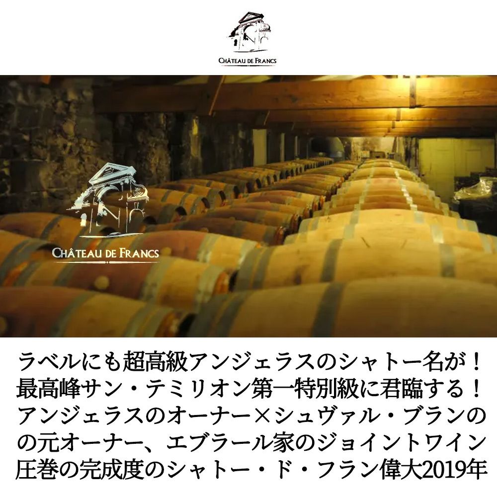 他の画像を見る シャトー ド フラン 2019 オーク樽熟成 AOCフラン コート ド ボルドー アルコール度数14.5%Chateau de Francs 2019 AOC Francs Cotes de Bordeaux (Chateau Angelus & Dominique Hebrard) 赤ワイン フランス フルボディ 辛口 当店特別価格 ¥ 2,069 税込 カートに入れる お気に入りに登録する