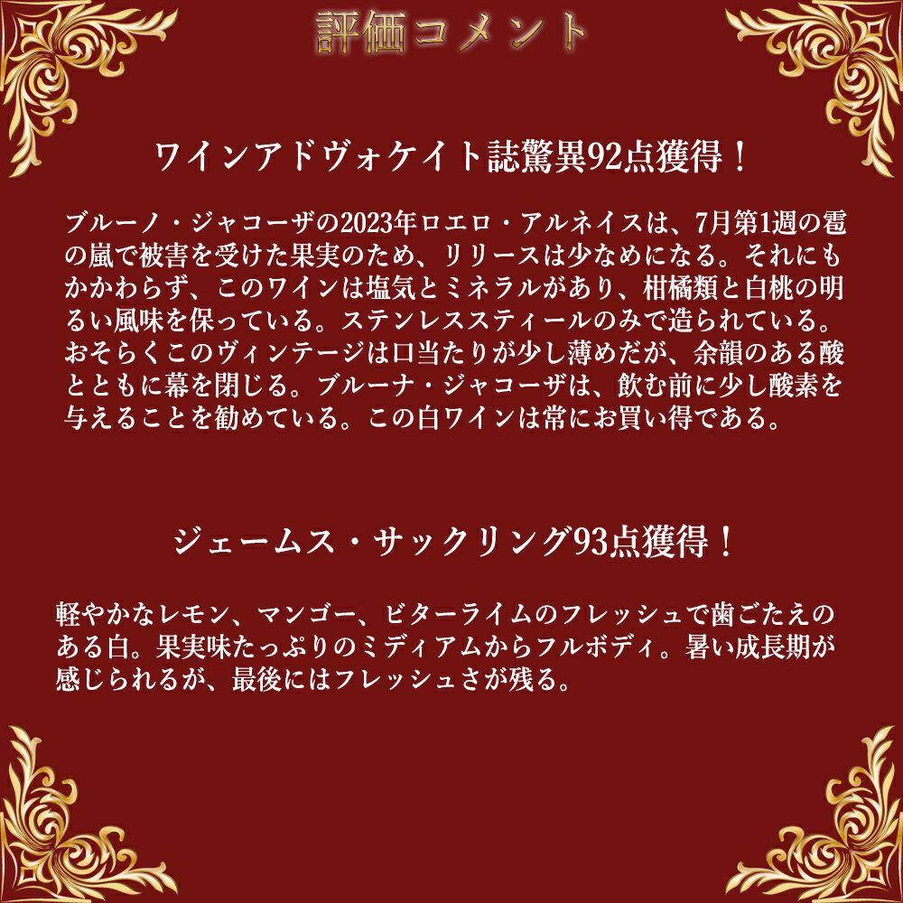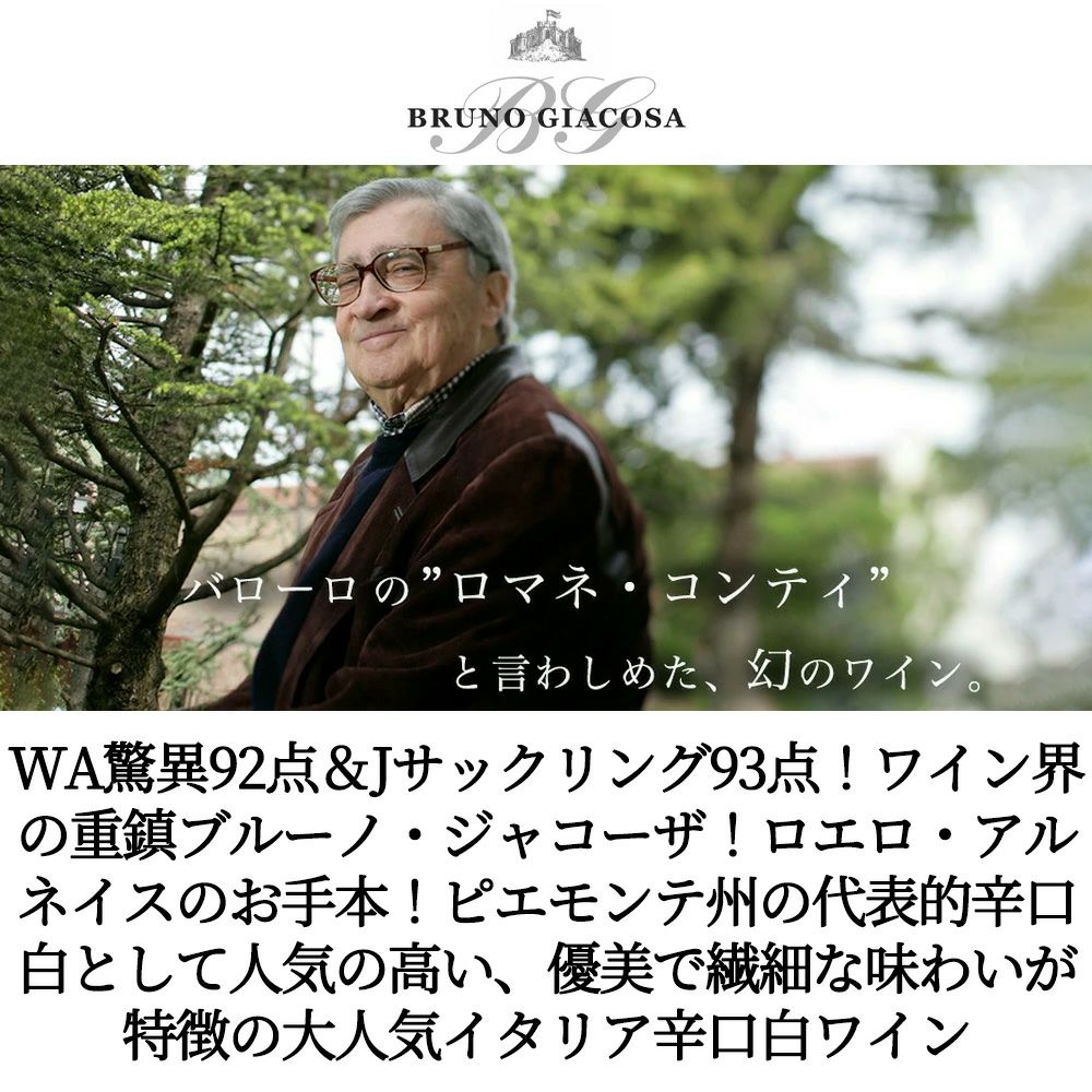 他の画像を見る ロエロ アルネイス 2023 ブルーノ ジャコーザ元詰 DOCGロエロ アルネイス 正規品 WA誌驚異92点&JS93点 白 辛口 イタリアRoero ARNEIS 2023 Bruno Giacosa DOCG Roero ARNEIS 白ワイン イタリア 辛口 当店特別価格 ¥ 5,935 税込 カートに入れる お気に入りに登録する
