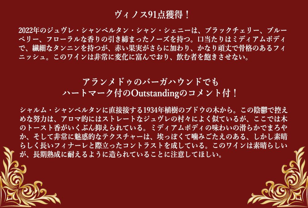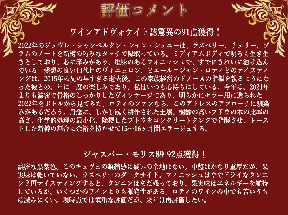 他の画像を見る ジュヴレ シャンベルタン シャン シェニ ヴィエイユ ヴィーニュ 2022 蔵出し限定品ドメーヌ ジョセフ ロティ家元詰 正規品 赤 辛口 フルボディGevrey Chambertin Champs Chenys Vieilles Vignes 赤ワイン フランス フルボディ 辛口 自然派 当店特別価格 ¥ 15,048 税込 カートに入れる お気に入りに登録する