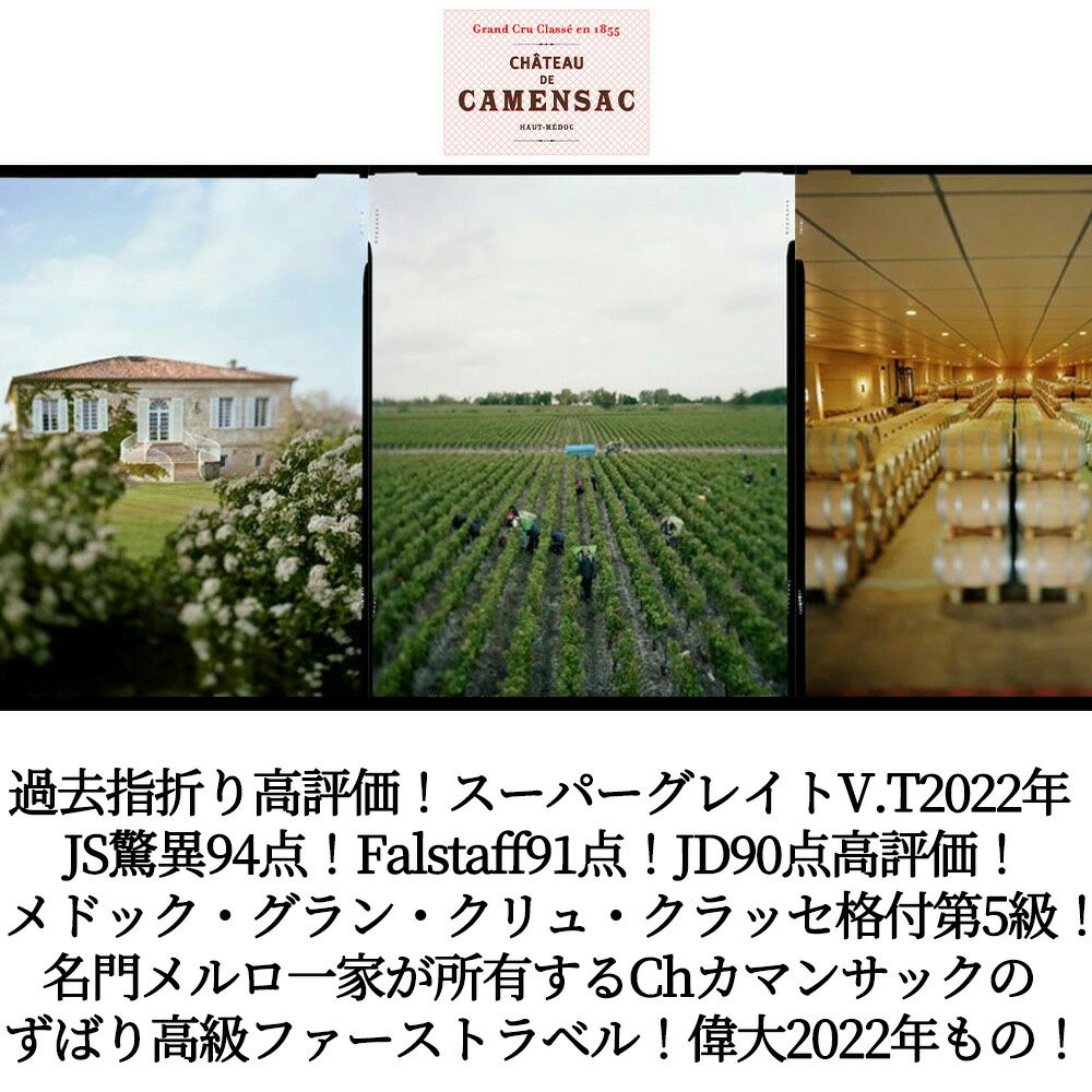 他の画像を見る シャトー カマンサック 2022 メドック グラン クリュ クラッセ 格付第五級 AOCオー メドック JS驚異の94点&JD90点&ヴィノス93点Chateau de CAMENSAC 2022 Grand Cru Classe du 赤ワイン フランス フルボディ 辛口 当店特別価格 ¥ 5,517 税込 カートに入れる お気に入りに登録する