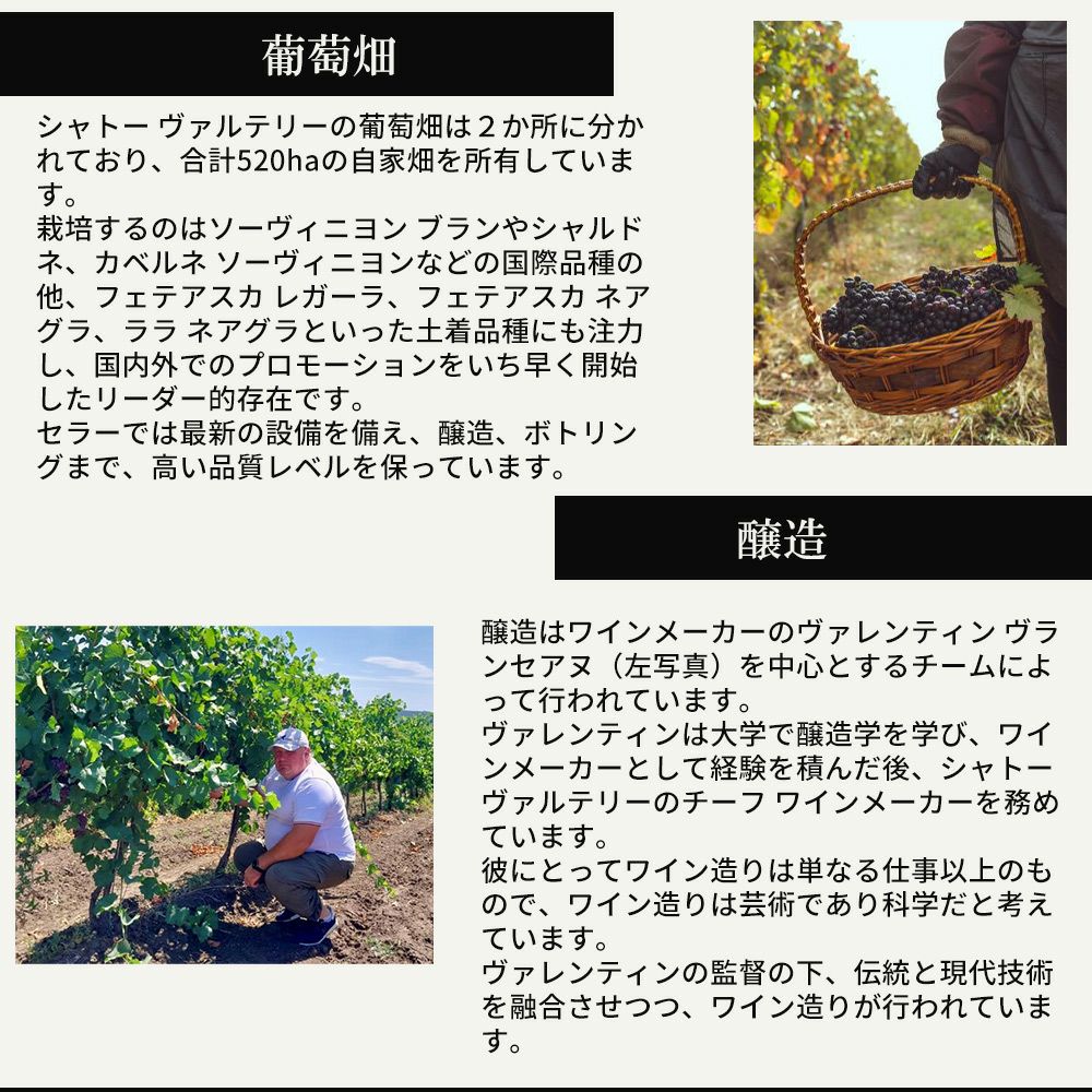 他の画像を見る シャトー ヴァルテリー トテム ヴィオリカ 2024 シャトー ヴァルテリー元詰 モルドバ共和国 正規品 IGP ヴァルル ルイ トラヤンChateau Vartely Totem Viorica 2024 Chateau Vartely 白ワイン 辛口 当店特別価格 ¥ 1,337 税込 カートに入れる お気に入りに登録する