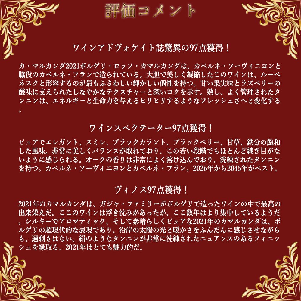 他の画像を見る カ マルカンダ カマルカンダ 2021 アンジェロ ガイア カマルカンダ エステート元詰 正規代理店輸入品 DOCGボルゲリ ロッソ 赤 辛口CA'MARCANDA CAMARCANDA 2021 GAYA IGT Toscana 赤ワイン イタリア フルボディ 辛口 当店特別価格 ¥ 21,829 税込 カートに入れる お気に入りに登録する