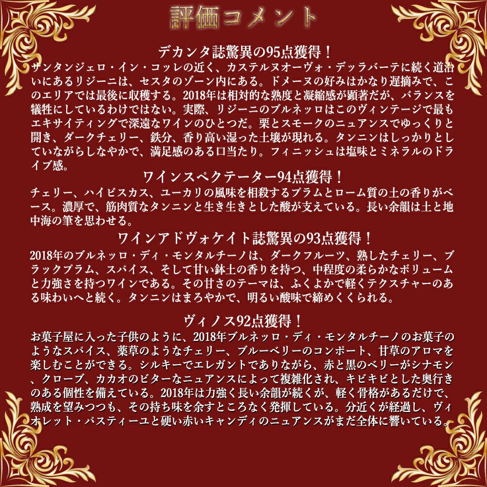 他の画像を見る ブルネッロ ディ モンタルチーノ 2018 手摘み100% オーク樽驚異の36ヶ月熟成+6ヶ月以上瓶熟成 アジエンダ アグリコーラ リジーニ元詰Brunello di Montalcino 2018 Az. Agr. LISINI DOCG 赤ワイン イタリア フルボディ 辛口 当店特別価格 ¥ 9,384 税込 カートに入れる お気に入りに登録する