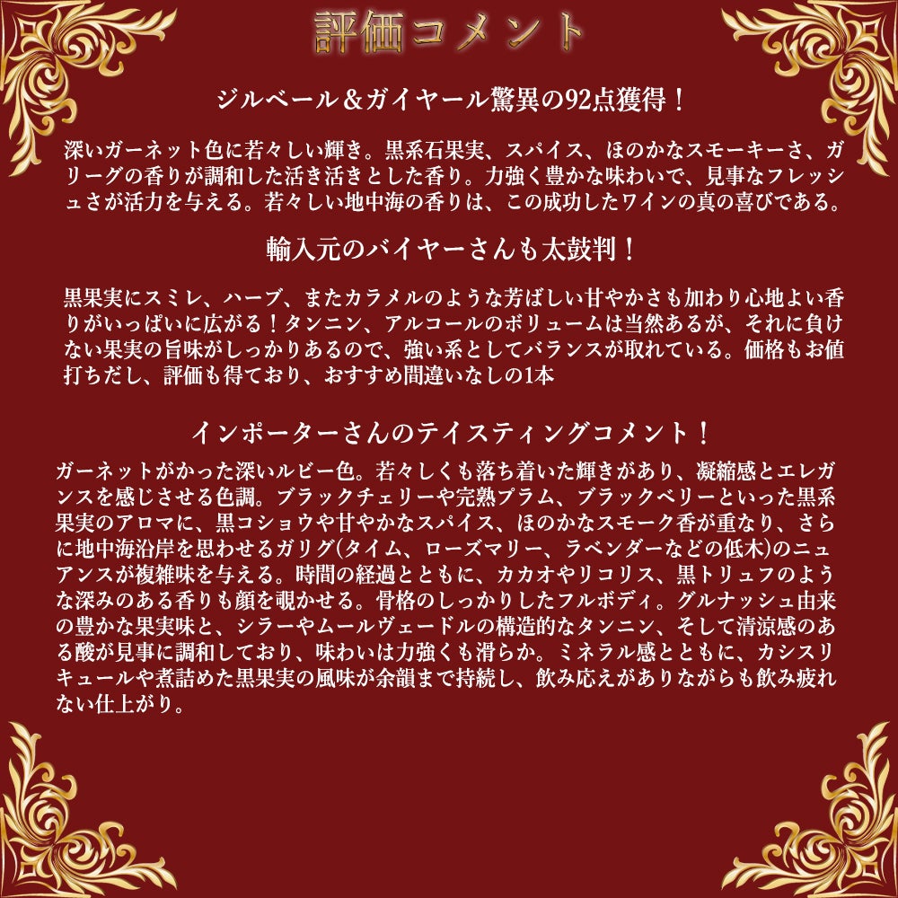 他の画像を見る シャトーヌフ デュ パプ 2023 シャトー ファーゲェロール (ファルゲイロル) AOCシャトーヌフ デュ パプ ジルベール&ガイヤール92点Chateauneuf du Pape 2023 Chateau Fargueirol AOC 赤ワイン フランス フルボディ 辛口 当店特別価格 ¥ 4,159 税込 カートに入れる お気に入りに登録する