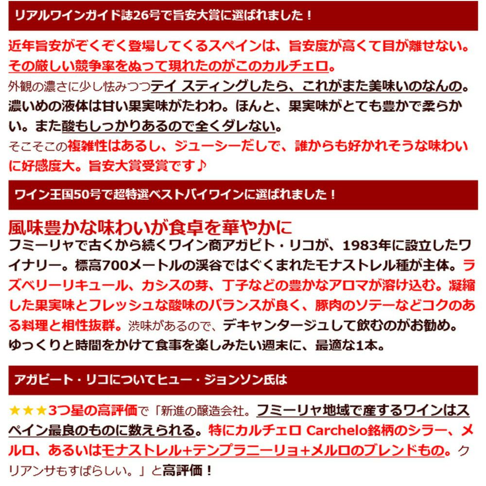 他の画像を見る カルチェッロ ティント 2022 ボデガス アガピト リコ元詰 D.Oフミーリャ 正規代理店輸入品 14.5% ユーロリーフ (オーガニック) 認証CARCHELO Tinto 2022 Bodegas Carchelo 赤ワイン スペイン フルボディ 辛口 自然派 当店特別価格 ¥ 2,340 税込 カートに入れる お気に入りに登録する