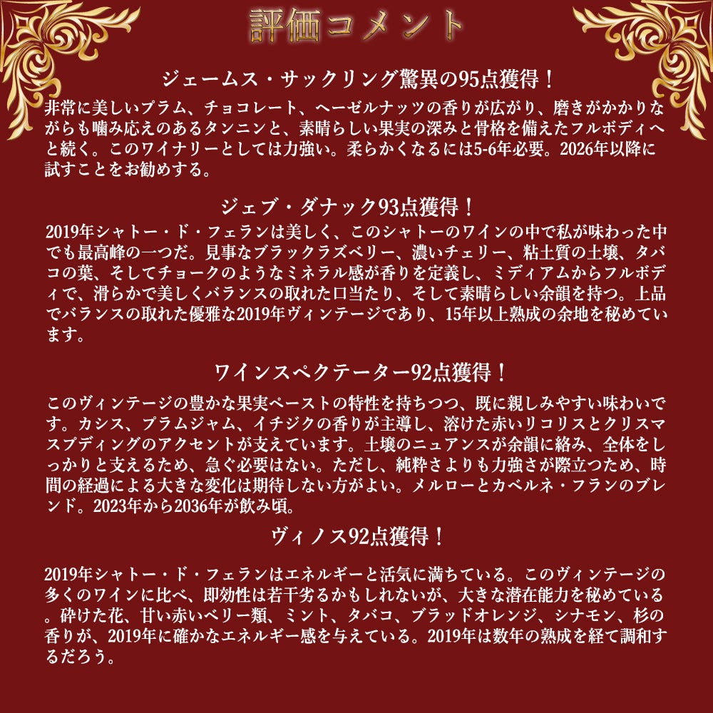 他の画像を見る シャトー ド フェラン 2019 AOCサン テミリオン グラン クリュ クラッセ特別級 JS驚異の95点&JD93点&WS92点&ヴィノス92点Chateau de Ferrand 2019 AOC Saint-Emilion Grand 赤ワイン フランス フルボディ 辛口 当店特別価格 ¥ 7,544 税込 カートに入れる お気に入りに登録する