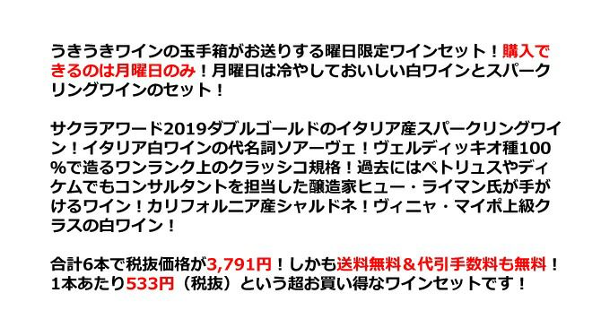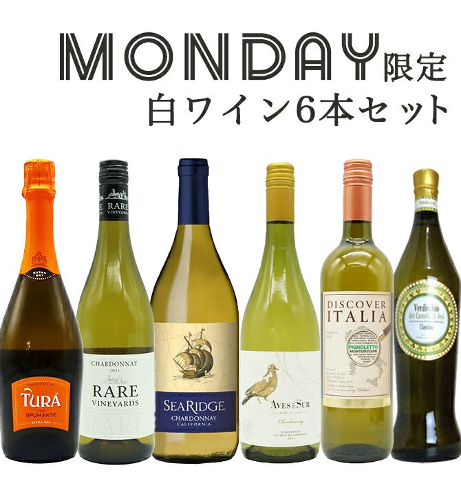 他の画像を見る 【超限定】【送料・代引手数料込】うきうきワイン究極月曜日白ワイン6本セット(辛口白5本、発泡1本)<月曜セット>※商品入荷状況により、一部セット内容を変更させて頂く場合がございます。予めご了承下さいます様お願い致します。 ワインセット 白ワイン スパークリング ワインセット 辛口 送料無料 当店特別価格 ¥ 3,961 税込 カートに入れる お気に入りに登録する