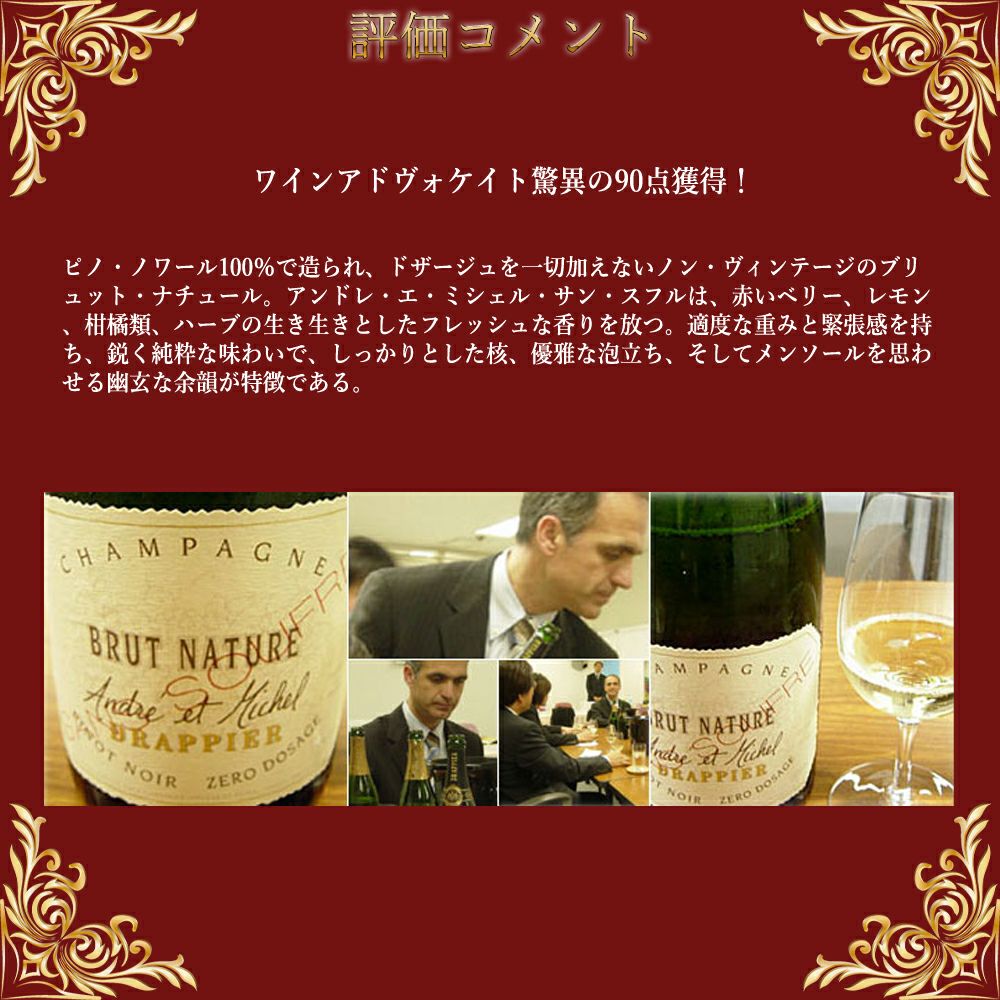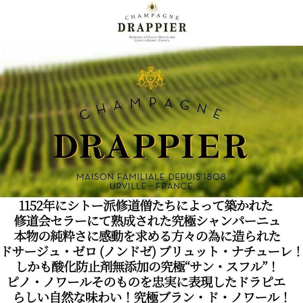 他の画像を見る ドラピエ シャンパーニュ ナチュール ゼロ ドサージュ サン スフル 酸化防止剤無添加 自然派 AOC (ブラン ド ノワール) 正規代理店輸入品DRAPPIER Champagne Brut Nature Pinot Noir Zero 白ワイン シャンパン フランス 辛口 自然派 当店特別価格 ¥ 8,861 税込 カートに入れる お気に入りに登録する
